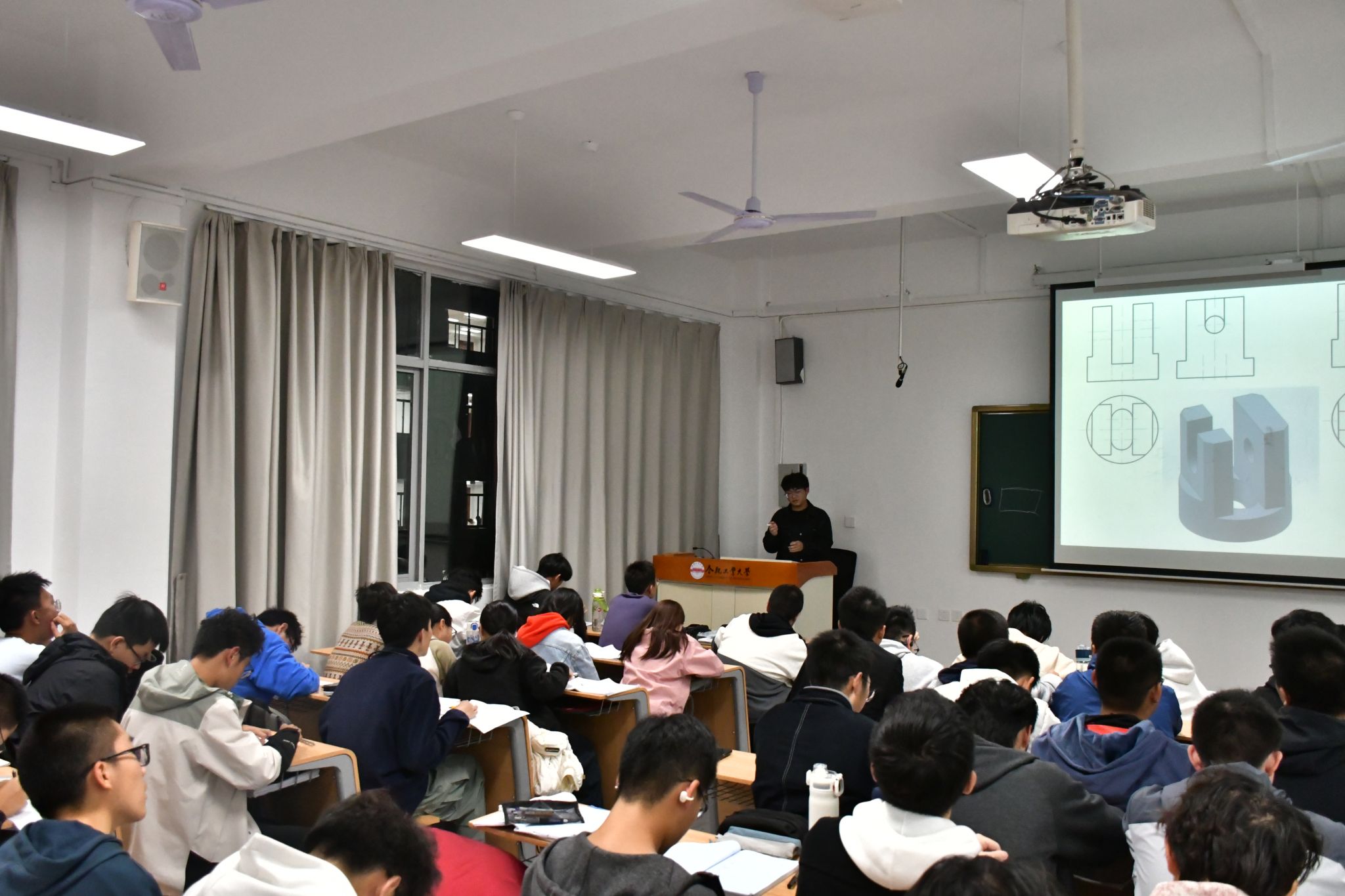 分享会伊始,主讲人首先通过黑板板书耐心且直观地为同学们解答了各类难题。在随后的学习经验分享环节,袁成结合自身的学习心得,系统性地介绍了高效的绘图方法。同时,他还现场演示了几种快速绘制标准三视图的实用技巧,同学们受益匪浅。